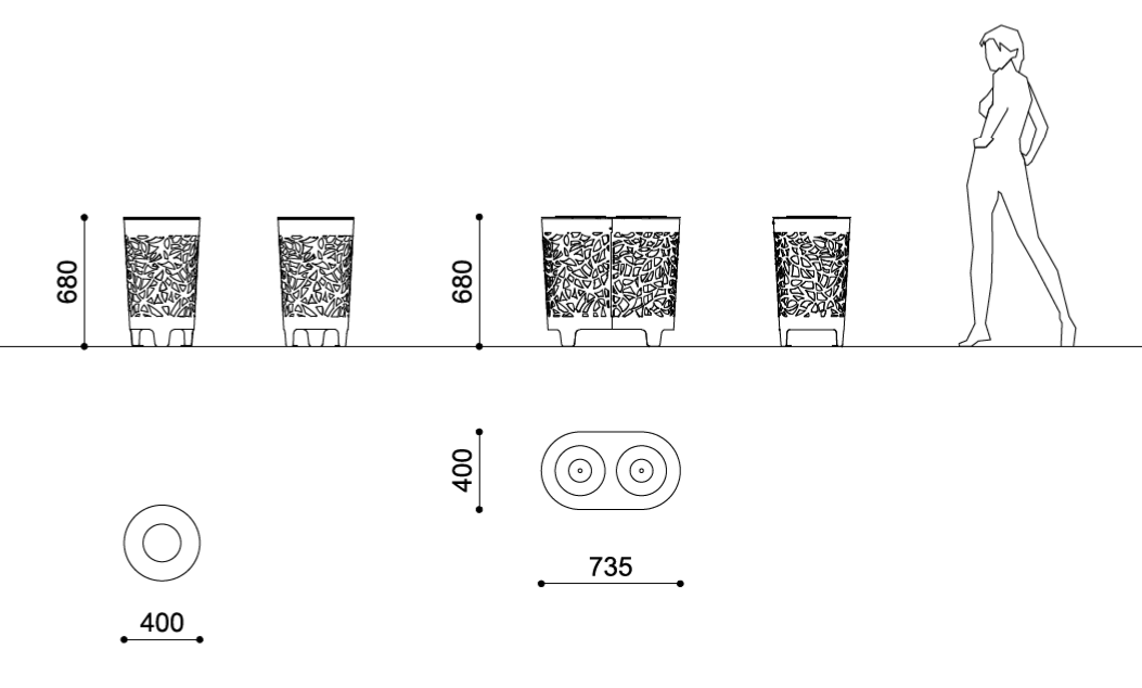 Conga ist ein Abfallbehälter aus pulverbeschichtetem Stahl oder Corten Stahl. Der Abfalleimer wiegt 16 kg und fasst 30 oder zweimal 30 Liter. Conga verfügt über einen entnehmbaren Innenbehälter für die einfache Entleerung. Der Abfallbehälter ist auch in doppelter Ausführung mit zwei getrennten Behältern erhältlich und kann somit als Mülltrenner verwendet werden.