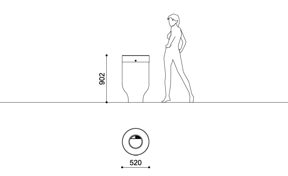 Zylindrischer Abfalleimer aus HPC, High Performance Concrete, Hochleistungsbeton für dünnwandige Bauteile mit feinen, matten Oberflächen, erhältlich in den Farben weiß, grau, dunkelgrau grün und gelb. Der Abfallbehälter verfügt über einen Edelstahldeckel mit zentralem Einwurf und einen Sackhaltering im Inneren.