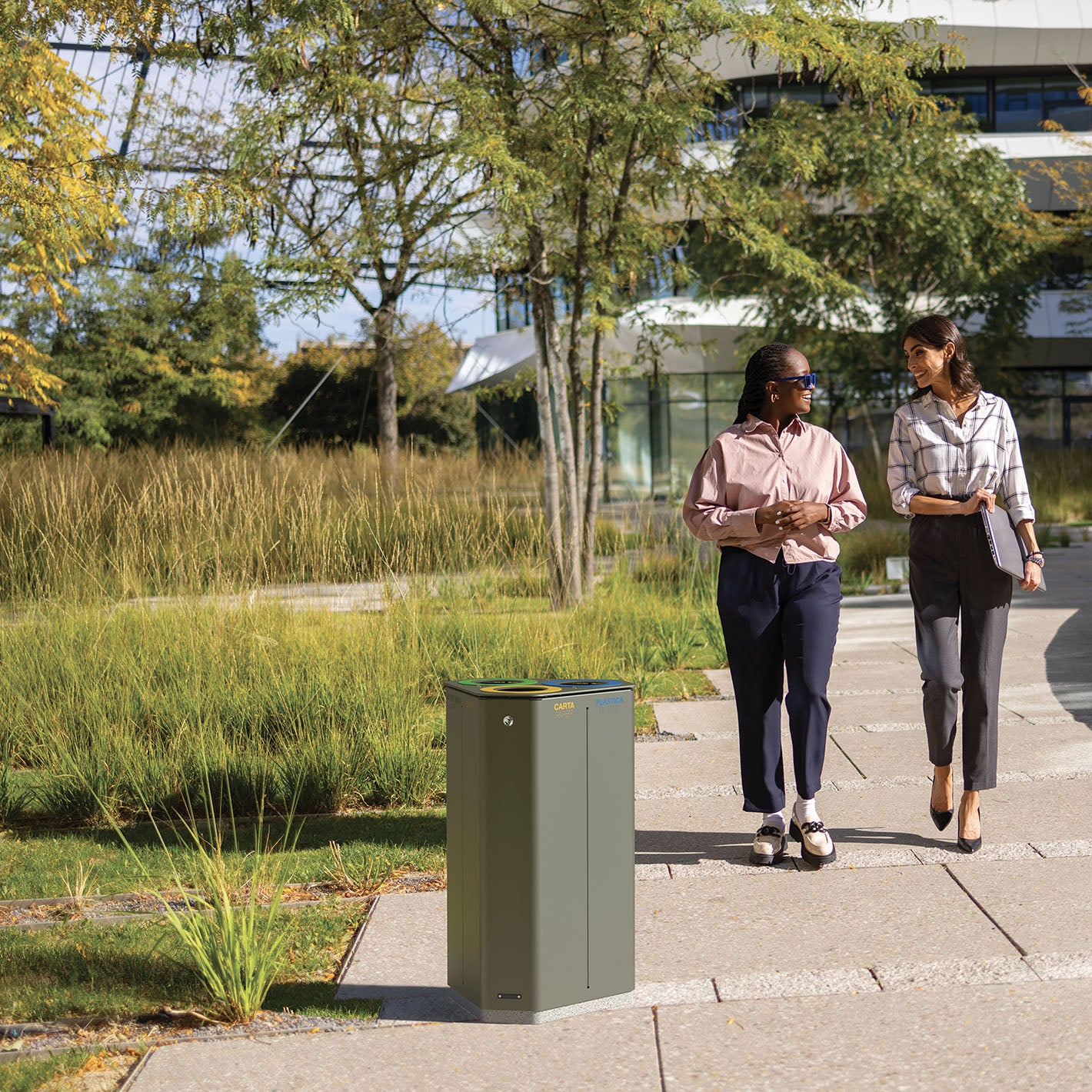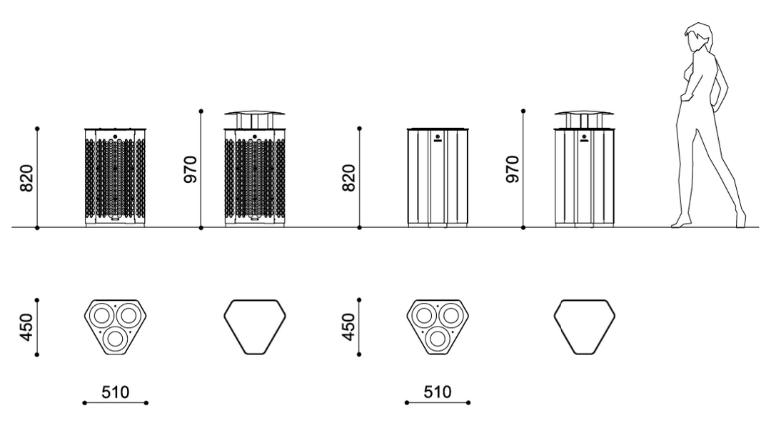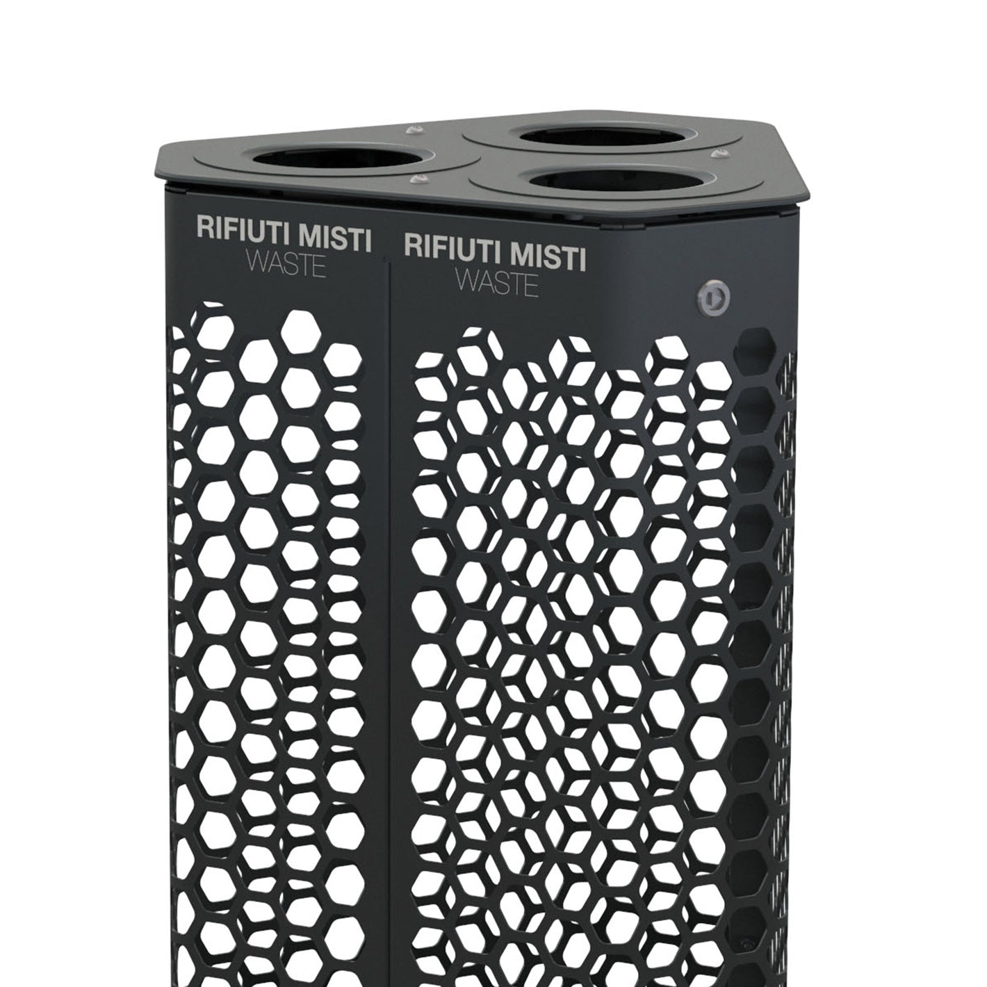 Der Mülltrenner Grand Carrè wird aus pulverbeschichtetem Stahl und pulverbeschichtetem Aluminium gefertigt und mit Betonsockel geliefert. Er kann wahlweise in vollflächigem oder perforiertem Stahlblech mit Wabenmuster ausgeführt werden. Der Abfallbehälter wird auf Wunsch und gegen Aufpreis mit einem Regendach und / oder einem Ascher ausgestattet. Der Abfalleimer kann mit individuellen Schriftzügen bedruckt oder beklebt werden um die Einwurföffnungen zu kennzeichnen.