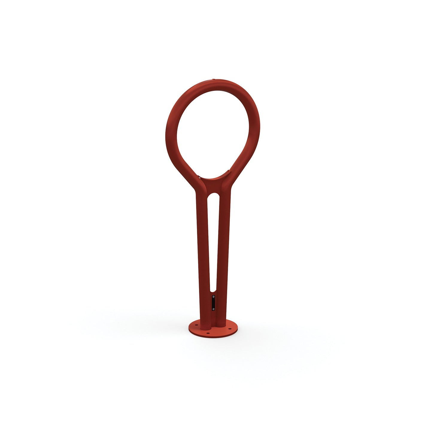 Point ist ein Fahrradparker aus gebogenem Stahlrohr mit Bodenplatte aus pulverbeschichtetem Stahlblech. Die Bodenplatte sorgt für Stabilität und erleichtert die Befestigung am Boden.