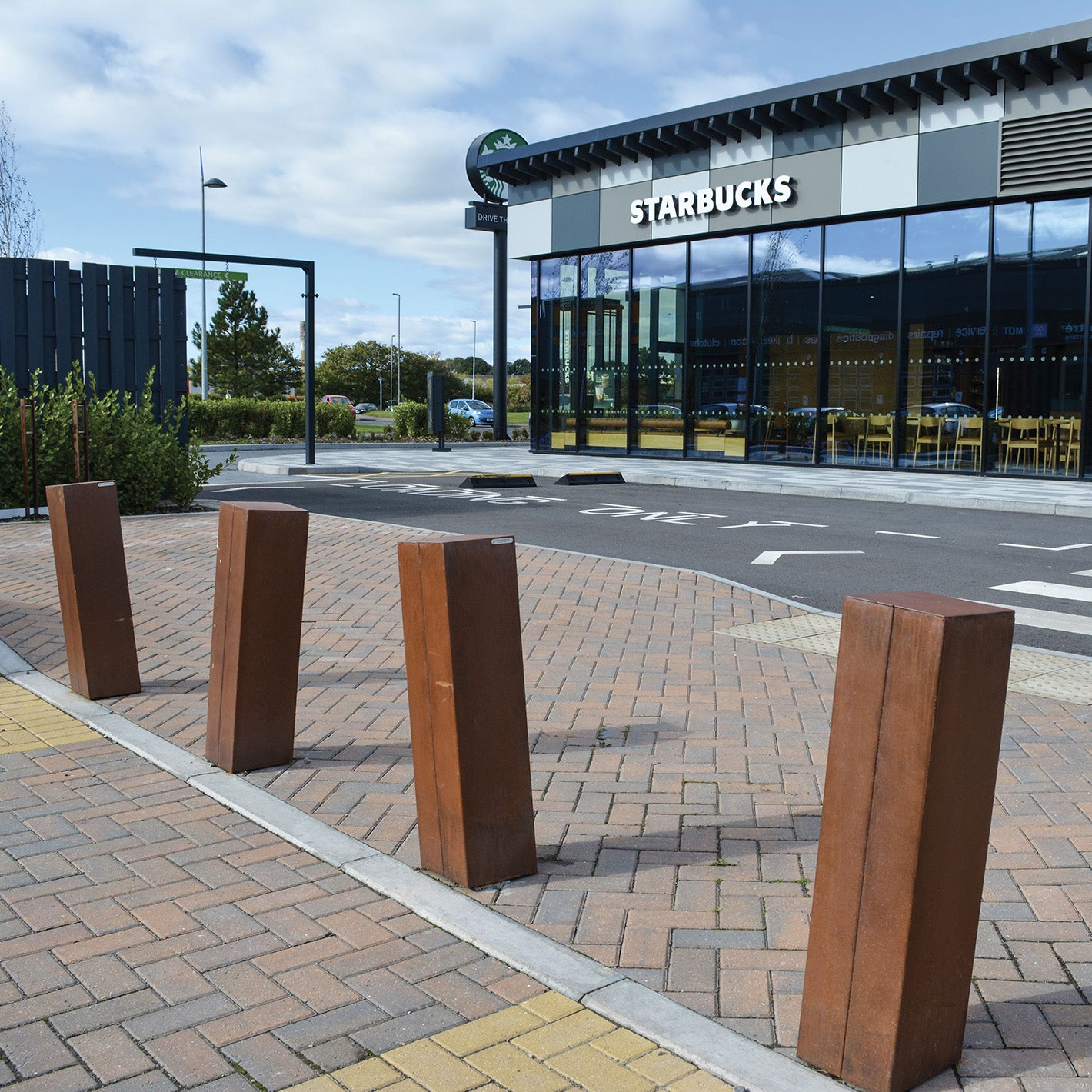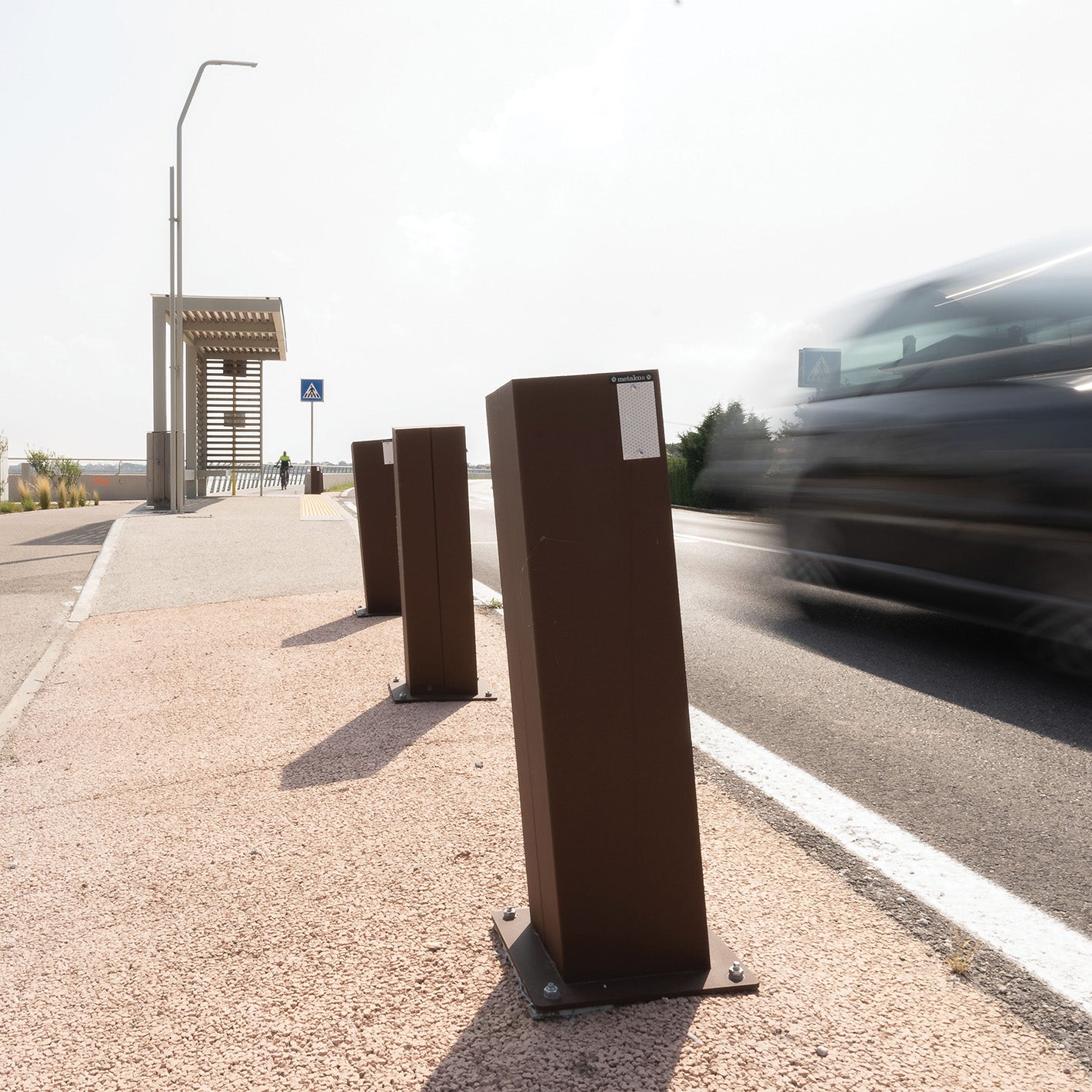 Hesperia ist ein Poller mit quadratischer Basis und schräg ansteigendem, vertikalem Aufbau, gefertigt wahlweise aus pulverbeschichtetem Stahlblech oder Corten Stahl mit dekorativen Rillen auf zwei gegenüberliegenden Seiten. Seine dynamische Geometrie macht ihn ideal für zeitgenössische, urbane Umgebungen und vereint Funktionalität mit einer klaren, visuellen Identität. Der Absperrpfosten ist mit Botenplatte zum Aufschrauben oder zum Einbetonieren erhältlich.
