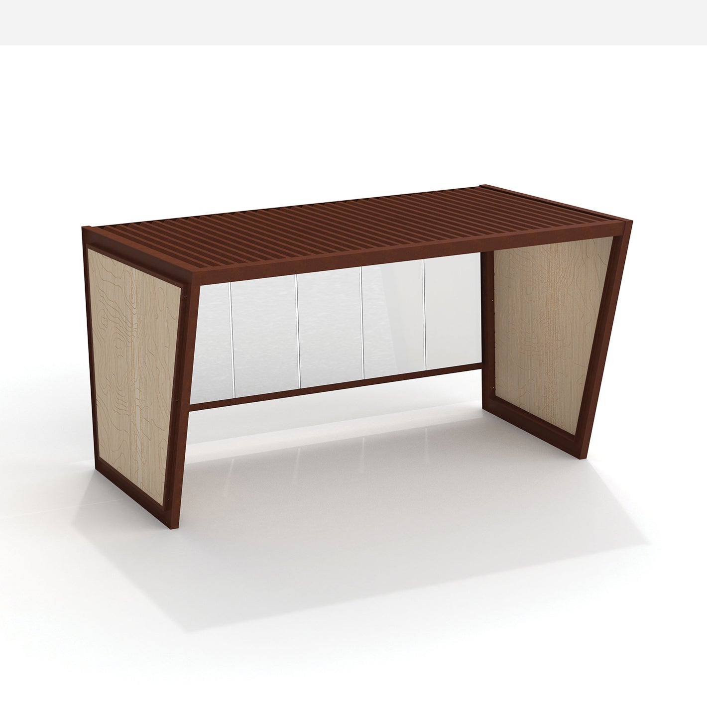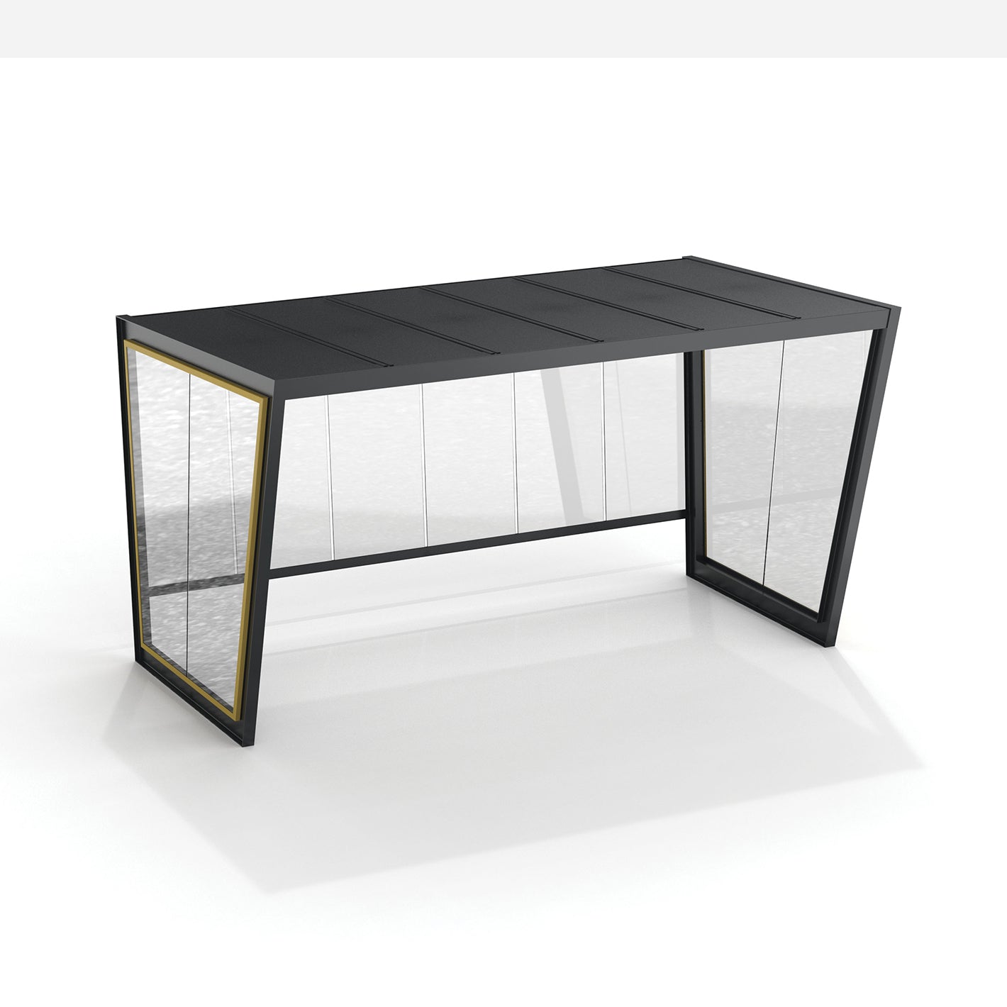 Die Überdachung Gateway ist in drei verschiedenen Ausführungen erhältlich. Die erste Variante ist mit einem Dach aus Glas und Rück- und Seitenwänden aus Glas ausgestattet. Die zweite verfügt über ein Dach aus pulverbeschichtetem Stahl, eine Rückwand aus Glas und Seitenwände aus Okumé Holz. Die dritte wird mit einem Dach aus pulverbeschichtetem Stahlblech und Rück- und Seitenwänden in Glas gefertigt.