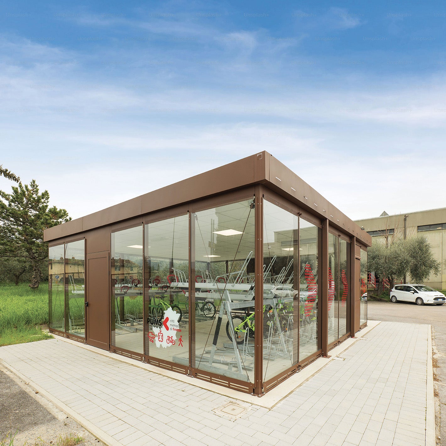 Velostazione ist eine Fahrradgarage, konzipiert um Schutz in öffentlichen und betrieblichen Umgebungen zu bieten und Ordnung zu schaffen. Die Grundstruktur besteht aus pulverbeschichtetem Stahl und Glaswänden, die für Transparenz und visuelle Leichtigkeit sorgen.