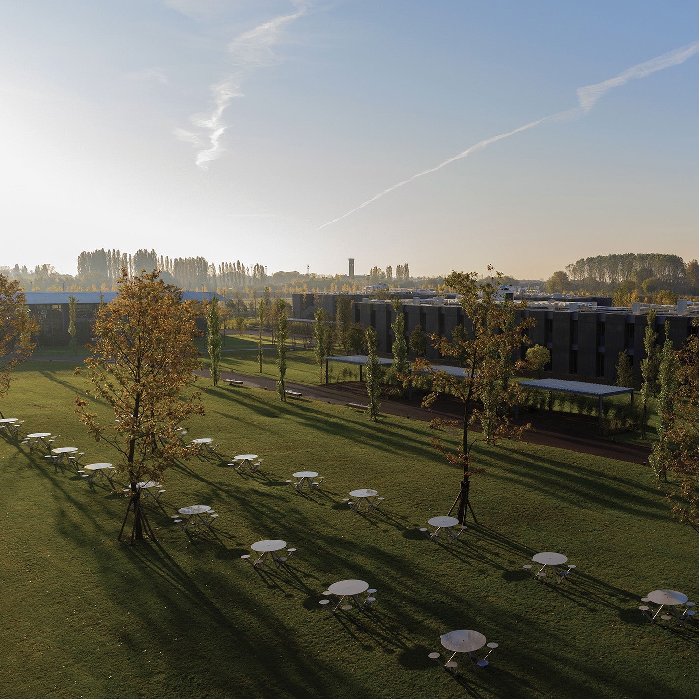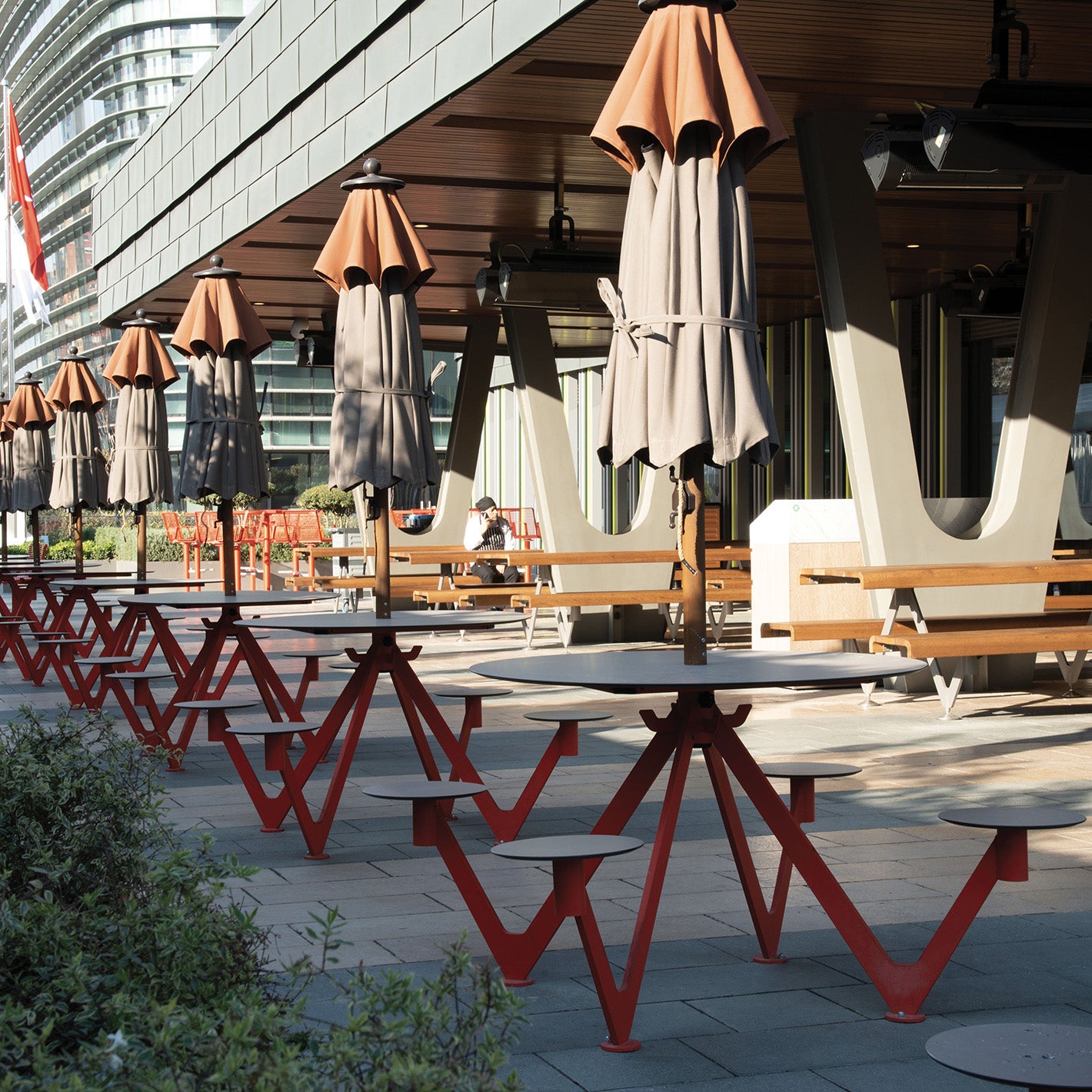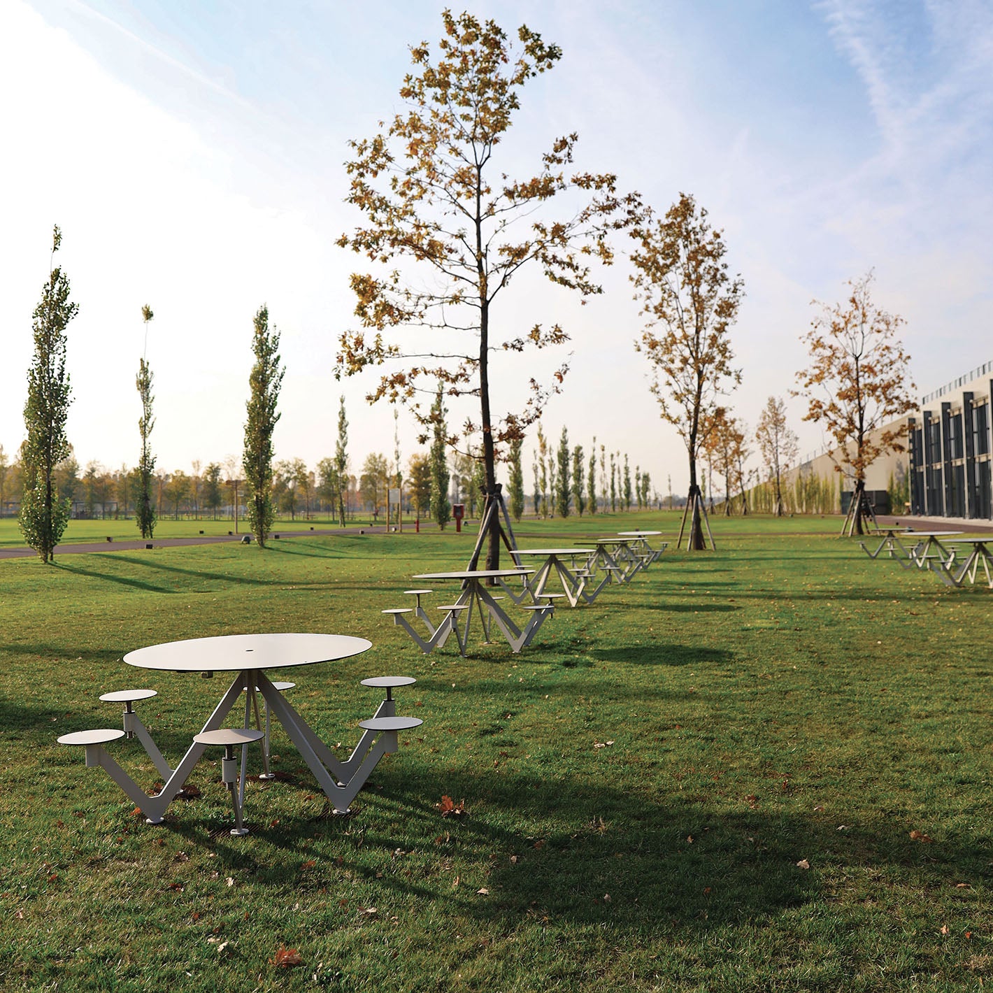 Air Circle ist eine Sitzgruppe bestehend aus einem runden Tisch wahlweise mit 4 oder 6 integrierten Hockern. Die Hocker sind aus HPL (High Pressure Laminate) - je nach Wunsch in den Farben weiß, schwarz oder taupe - gefertigt. Die Grundkonstruktion wird aus dickem, pulverbeschichteten Stahlblech hergestellt. Die Sitzgruppe ist in vier Varianten erhältlich und wird zum Aufschrauben geliefert.