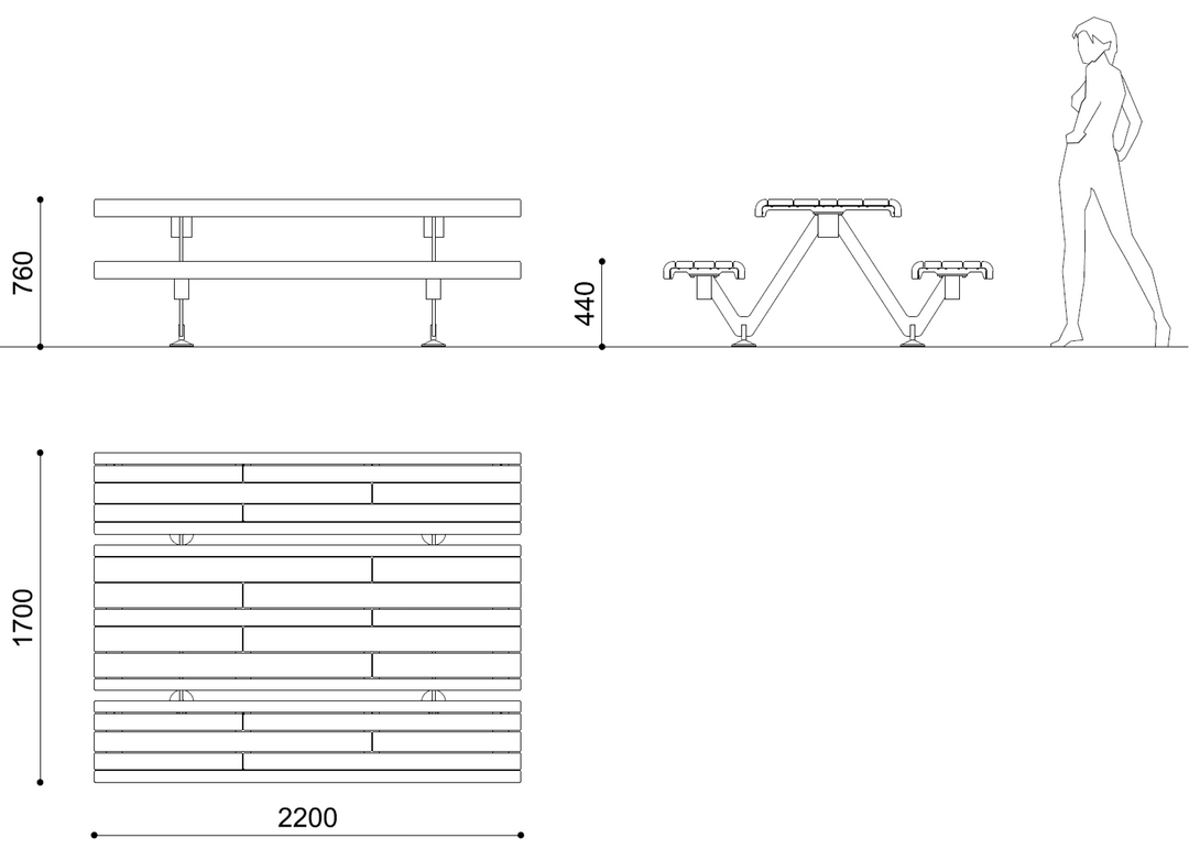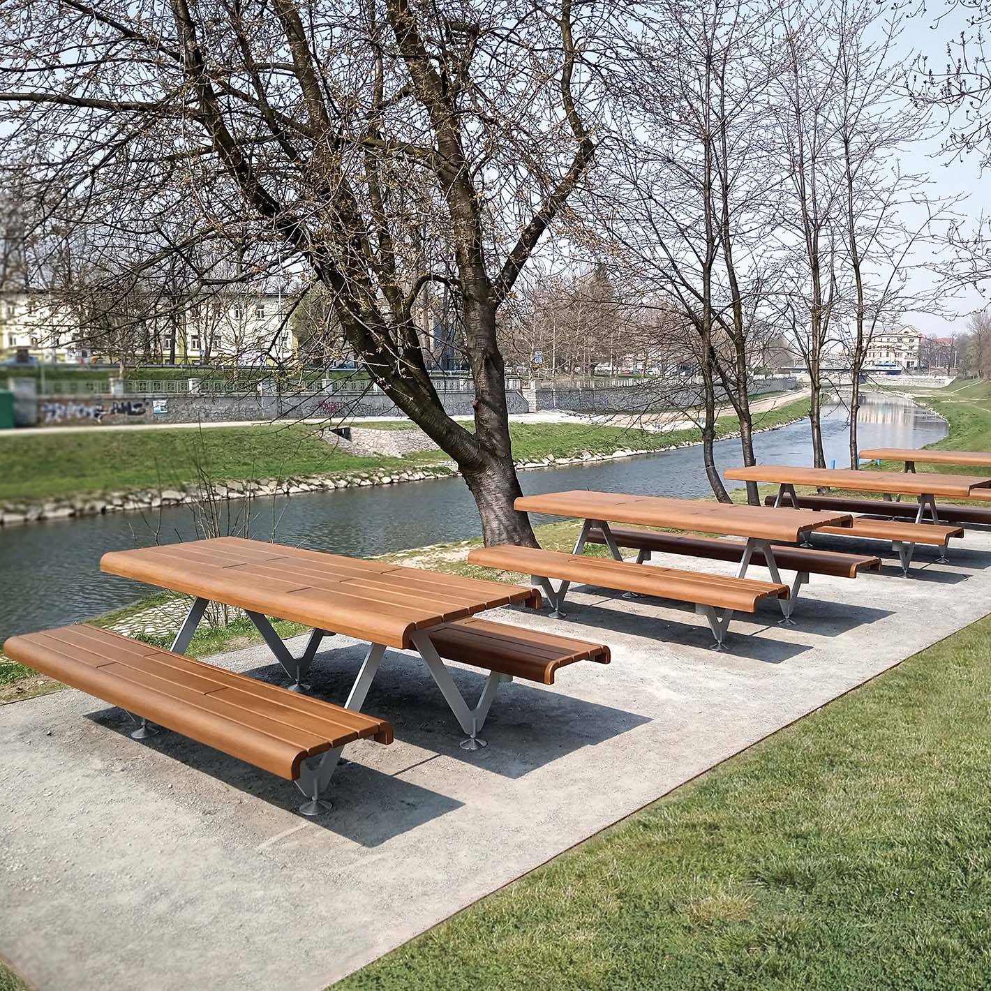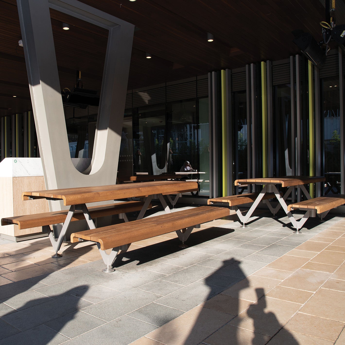 Die Air-L Sitzgruppe besteht aus einem einzigen Element und wird wahlweise in wärmebehandeltem Pinienholz oder in Hartholz gefertigt. Die Grundkonstruktion wird in pulverbeschichtetem Stahl ausgeführt. Air-L kann optional und gegen Aufpreis mit Anti-Diebstahl Schrauben geliefert und gesichert werden.