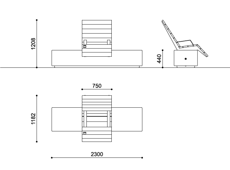 Die Alterego Liege aus Hartholz wird auf die Hockerbank der I-Box Serie mit 2300 mm Länge montiert und verfügt über zwei Armlehnen aus Edelstahl.