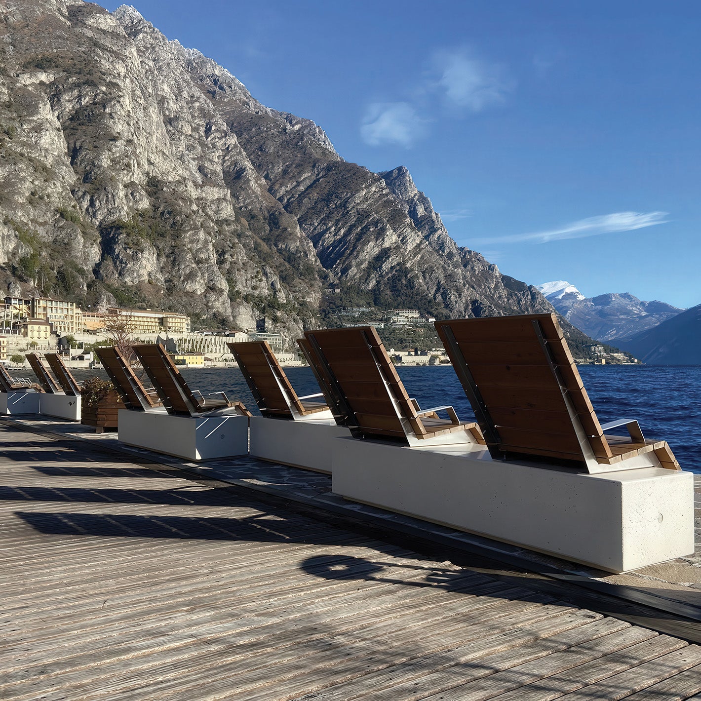 Mit der Alterego Serie können ganze Landschaften im öffentlichen Raum geschaffen werden. Sie umfasst Parkbänke, Tische, Liegen, Blumentröge sowie Überdachungen, die individuell zusammengestellt werden können.