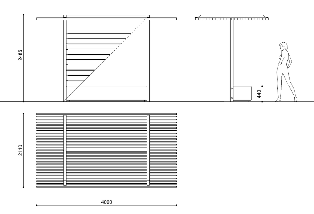 Alterego OM ist eine Überdachung, die mit der I-Box Hockerbank in HPC (High Performance Concrete: Hochleistungsbeton für dünnwandige Bauteile mit feinen, matten Oberflächen erhältlich in den Farben - weiß, grau, dunkelgrau, grün und gelb) kombiniert ist. Die Überdachung besteht aus einer Tragstruktur aus pulverbeschichtetem Stahlrohr mit einem Dach aus Stahlstäben. Alterego OM ist mit oder ohne gespannten Edelstahlkabeln zwischen den Trägern erhältlich.