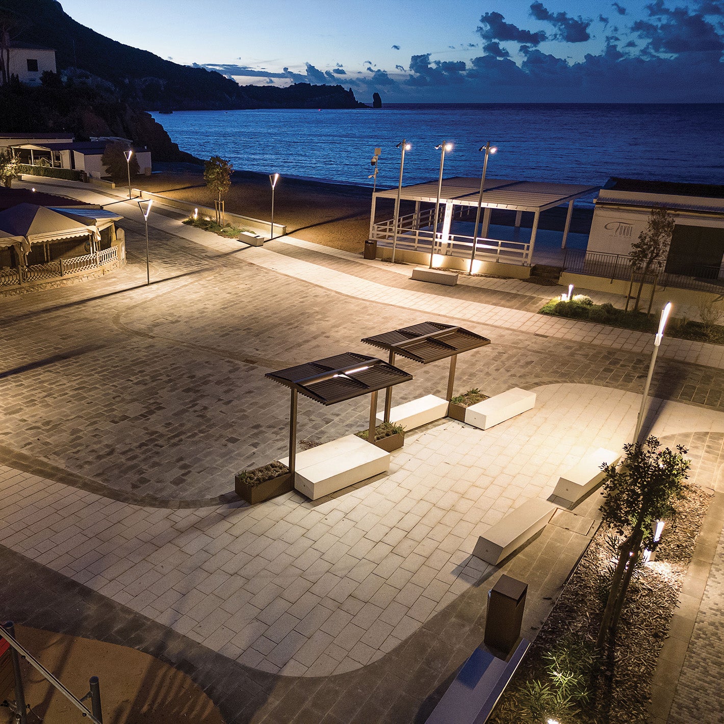 Alterego OM ist eine Überdachung, die mit der I-Box Hockerbank in HPC (High Performance Concrete: Hochleistungsbeton für dünnwandige Bauteile mit feinen, matten Oberflächen erhältlich in 3 Farben - weiß, grau und dunkelgrau) kombiniert ist. Die Überdachung besteht aus einer Tragstruktur aus pulverbeschichtetem Stahlrohr mit einem Dach aus Stahlstäben. Alterego OM ist mit oder ohne gespannten Edelstahlkabeln zwischen den Trägern erhältlich.