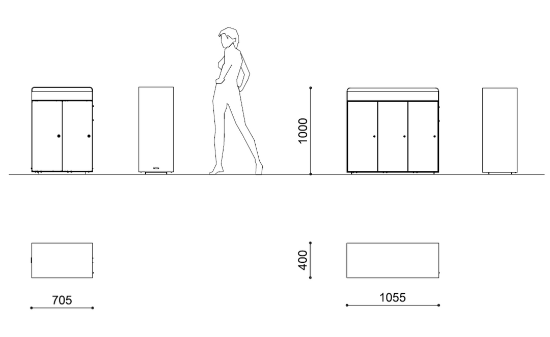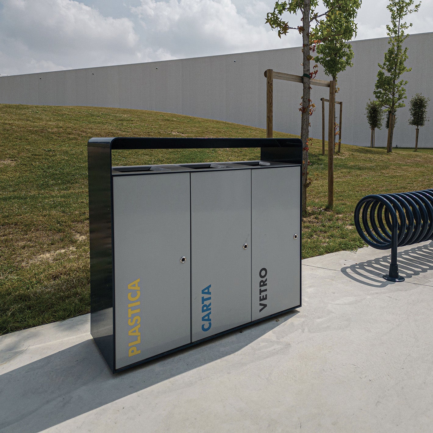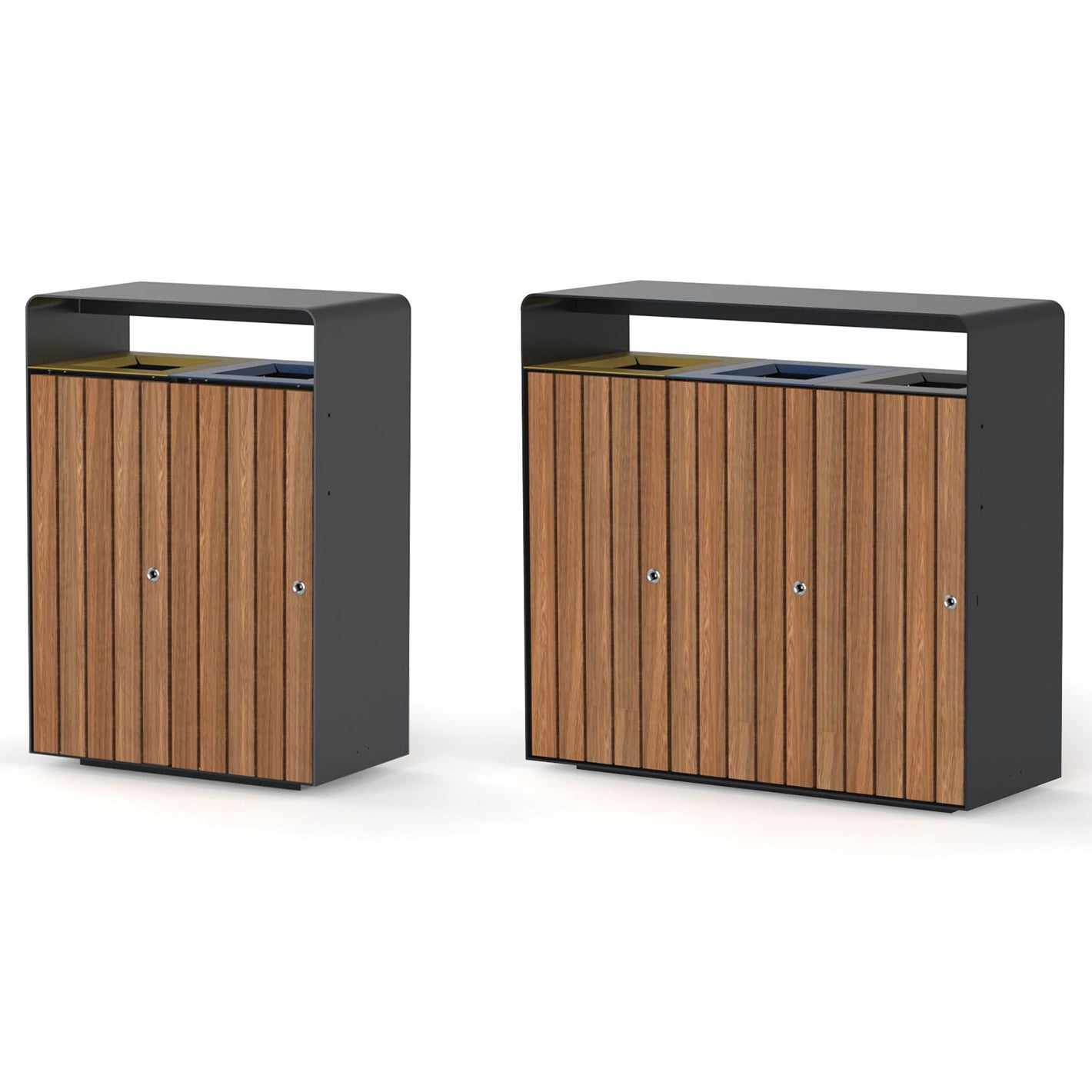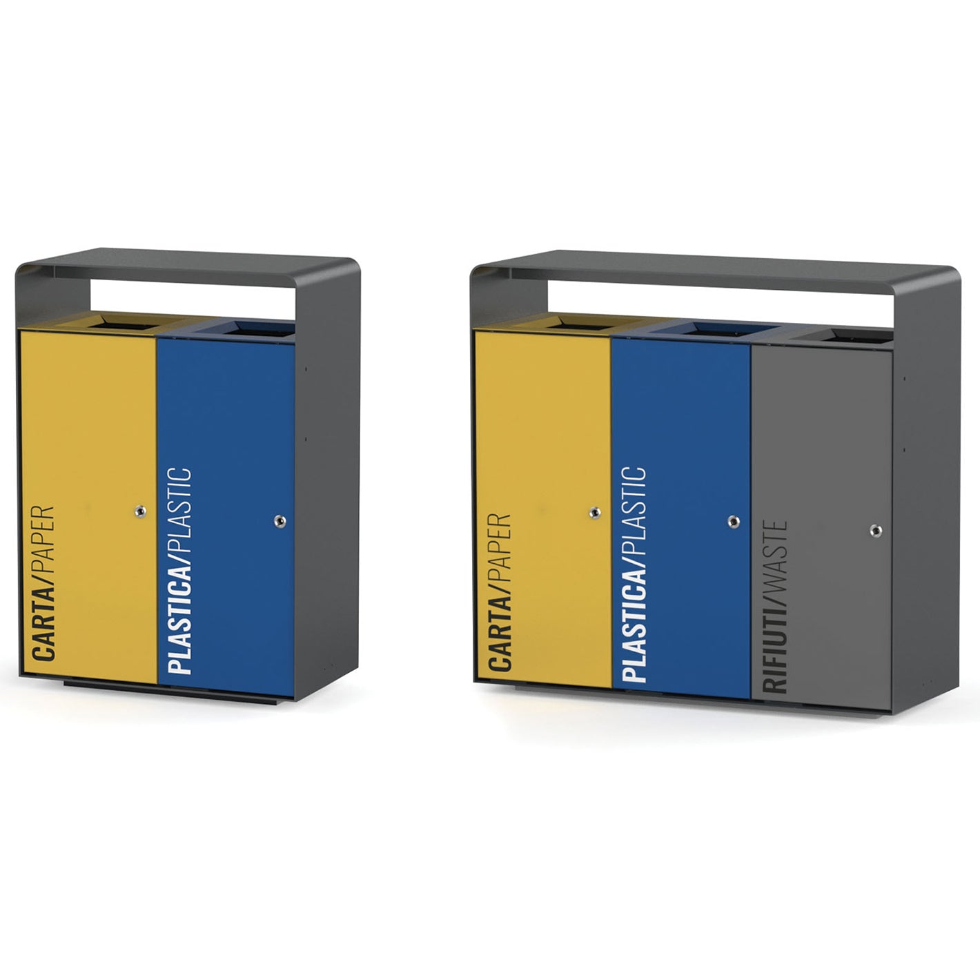 Der rechteckige Abfallbehälter wird aus einer tragenden Struktur aus dickwandigem, pulverbeschichtetem Stahlblech gefertigt, die Stabilität und Widerstandsfähigkeit gewährleistet. Der Abfalleimer verfügt wahlweise über zwei oder drei Abteilungen zur Mülltrennung. Die Türen werden in pulverbeschichtetem Stahlblech oder in Ipe Holz ausgeführt und sind mit einem Schnappschloss ausgestattet. Die Regenabdeckung schützt vor Feuchtigkeit, während die Einwurftrichter ein sauberes und geordnetes Einwerfen der Abfälle ermöglichen. Im Inneren befinden sich je nach Modell Sackhalterringe zur Befestigung von Müllsäcken oder Innenbehälter. Bund eignet sich perfekt für die differenzierte Sammlung und verbindet Funktionalität mit einem robusten Design. Der Ascher Fuma kann optional und gegen Aufpreis an allen Bund Modellen angebracht werden.
