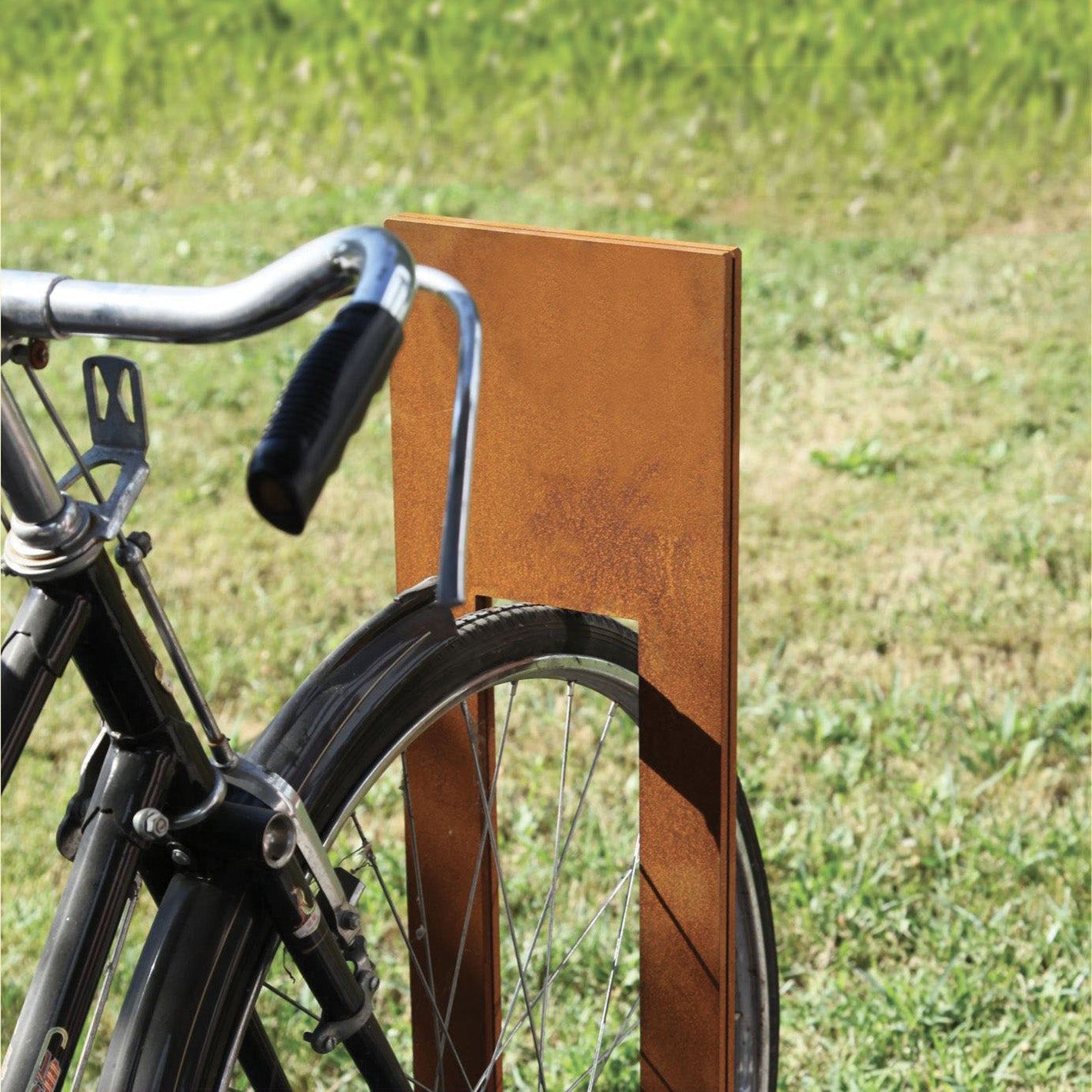 Fahrradständer aus Stahl, gefertigt aus zwei lasergeschnittenen Blechen, die mittels eines dazwischenliegenden Abstandshalters miteinander verbunden sind. Dieses innovative Design ermöglicht die Individualisierung, da der obere Teil der Bleche gelasert werden kann, um Logos oder Schriftzüge einzufügen.