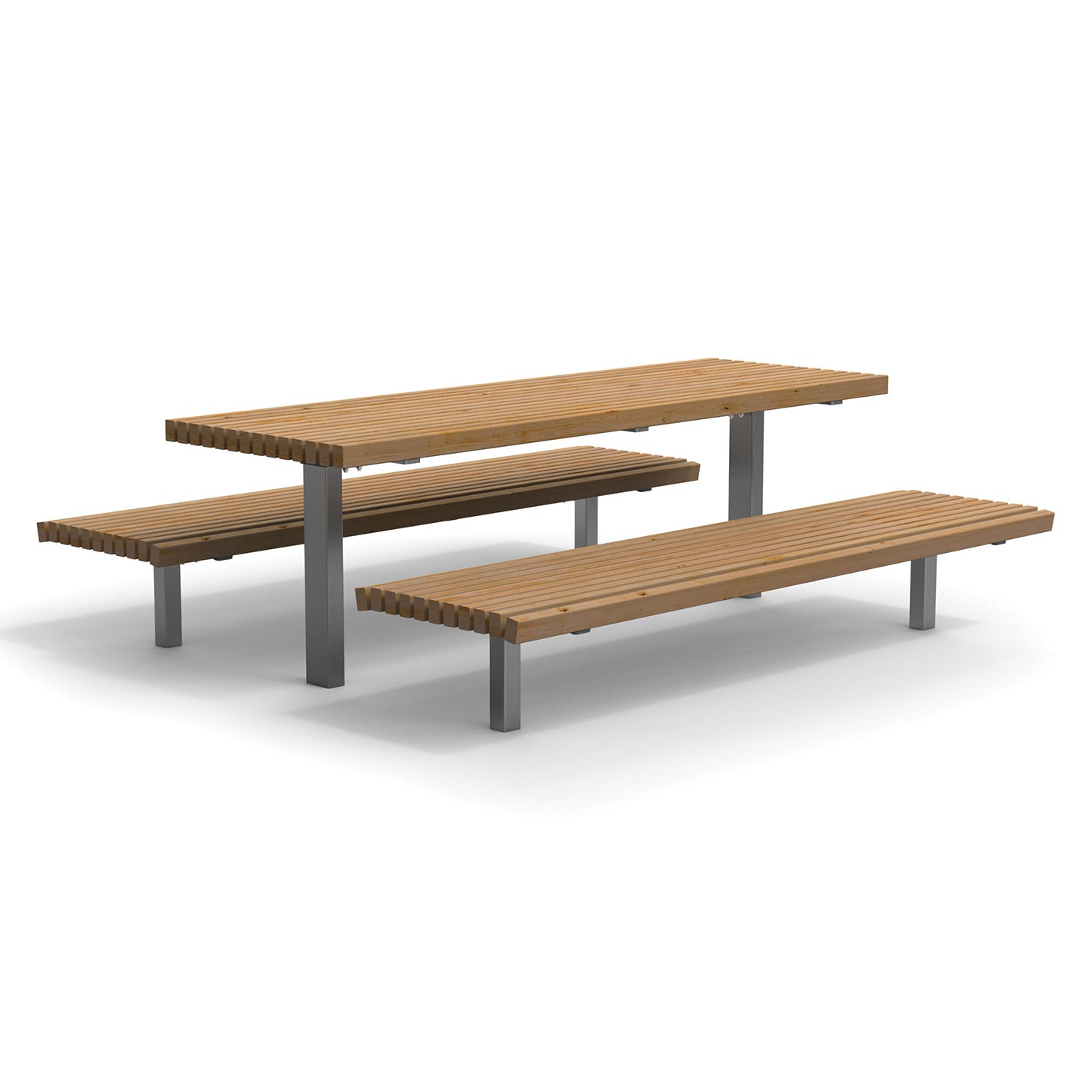 Die Sitzgruppe Meyrin ist individuell gestaltbar. Die Sitzbänke der Serie sind als Hockerbank ohne Rückenlehne sowie als Sitzbank mit Rückenlehne in 2300 mm Länge oder in 3000 mm Länge erhältlich. Die Bank- bzw. Tischfüße werden aus pulverbeschichtetem Stahl gefertigt. Die Belattung ist wahlweise in Hartholz oder in wärmebehandeltem Pinienholz lieferbar. Die Tische sind ebenfalls in den Längen 2300 mm oder 3000 mm verfügbar. Die Sitzgruppe wird zum Einbetonieren oder zum Aufschrauben mit Bodenplatte ausgestattet. Die Modelle mit Rückenlehne können mit Armlehnen geliefert werden.