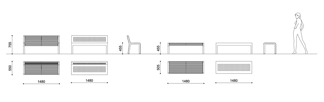 Die Parkbänke Mood MS(T) + MP(T) sind in zwei Ausführungen erhältlich. Die Sitzbänke werden wahlweise in pulverbeschichtetem Stahlblech oder in pulverbeschichteten Stahlstäben ausgeführt und werden nach Wahl mit Rückenlehne oder als Hockerbänke ohne Rückenlehne geliefert.