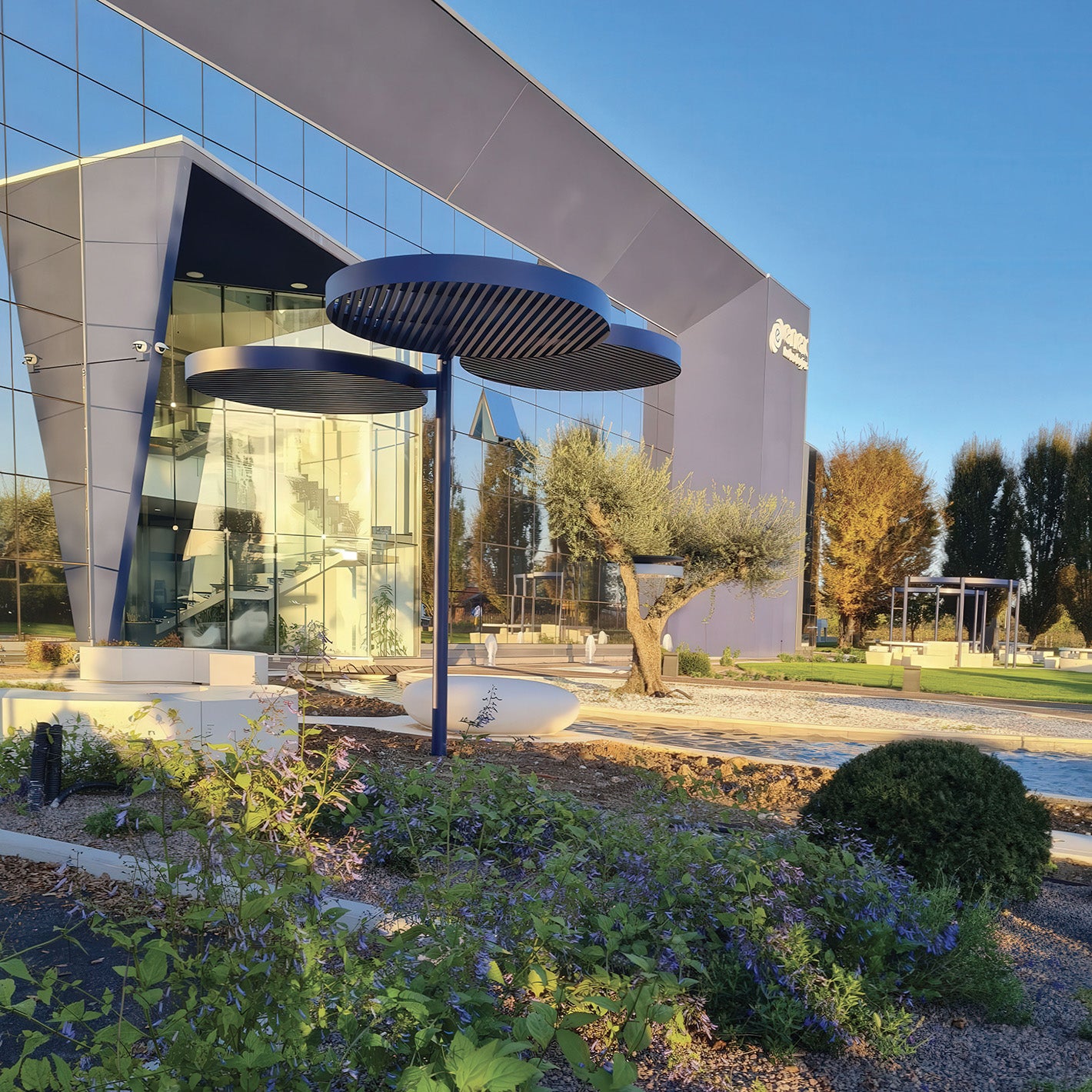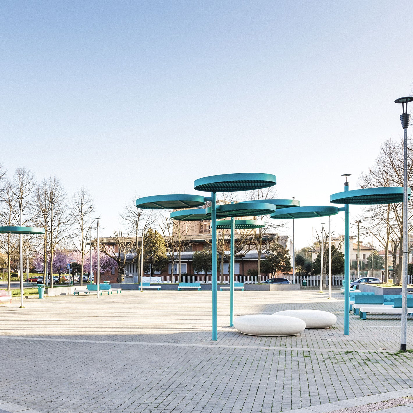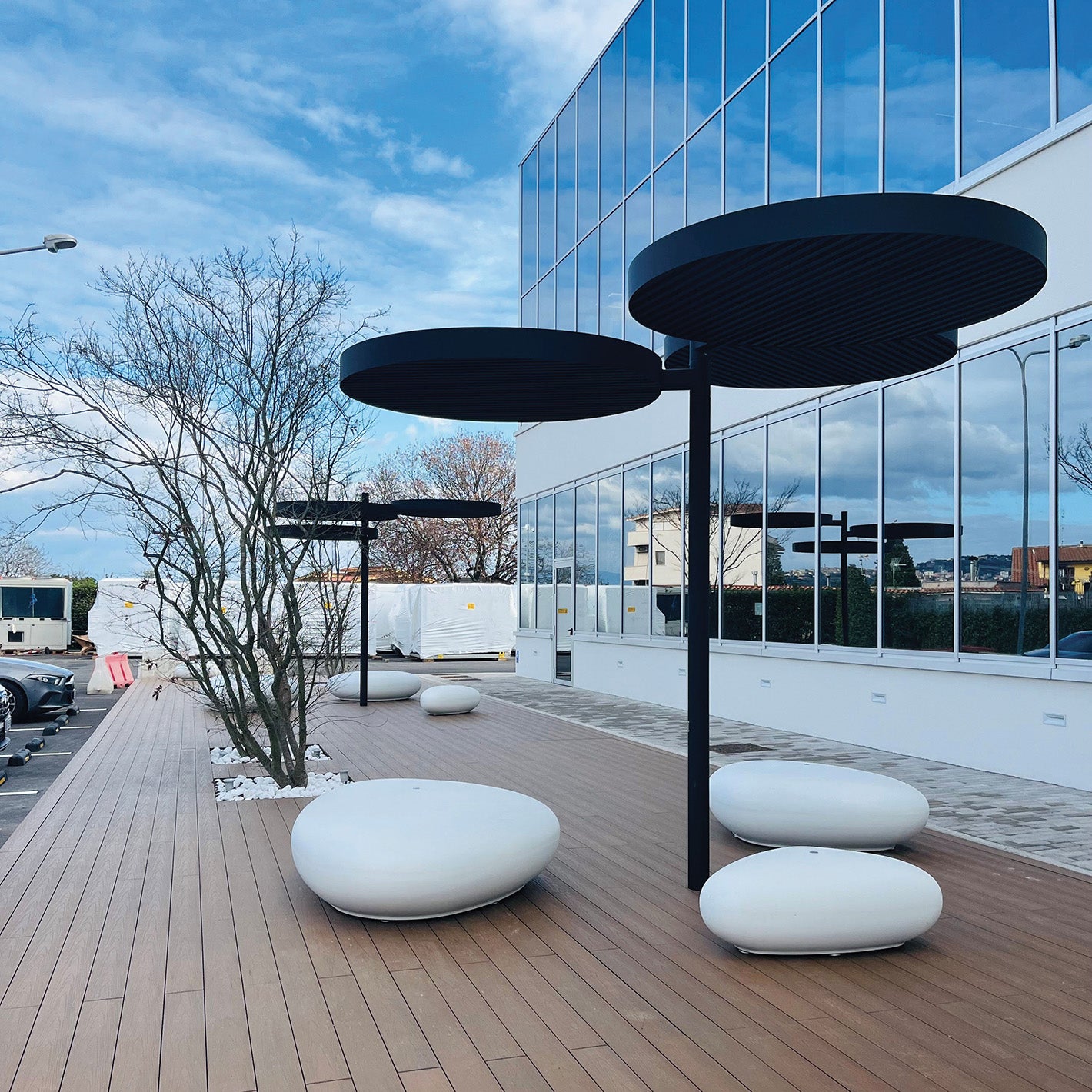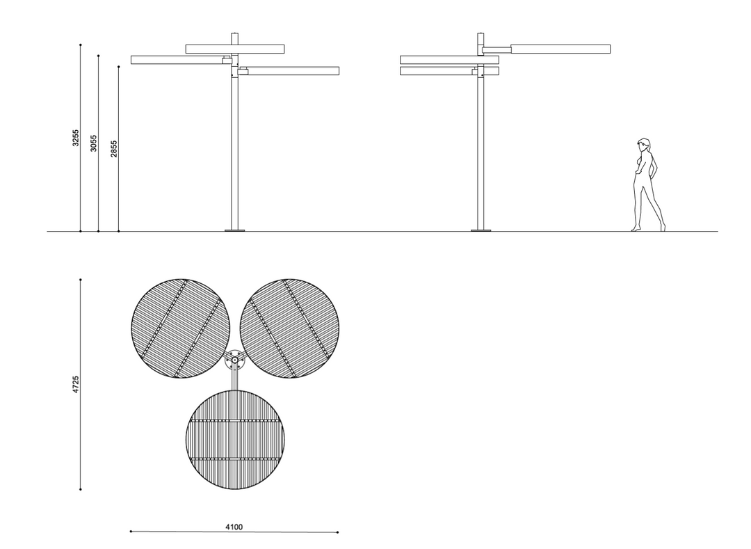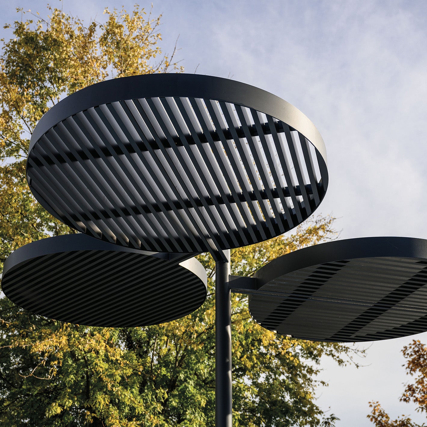 Die Überdachung Petals besteht aus einer tragenden Säule und drei runden, höhenversetzten, schattenspendenden Dächern, die aus einem pulverbeschichteten Stahlrahmen und pulverbeschichteten Aluminiumlamellen bestehen.
