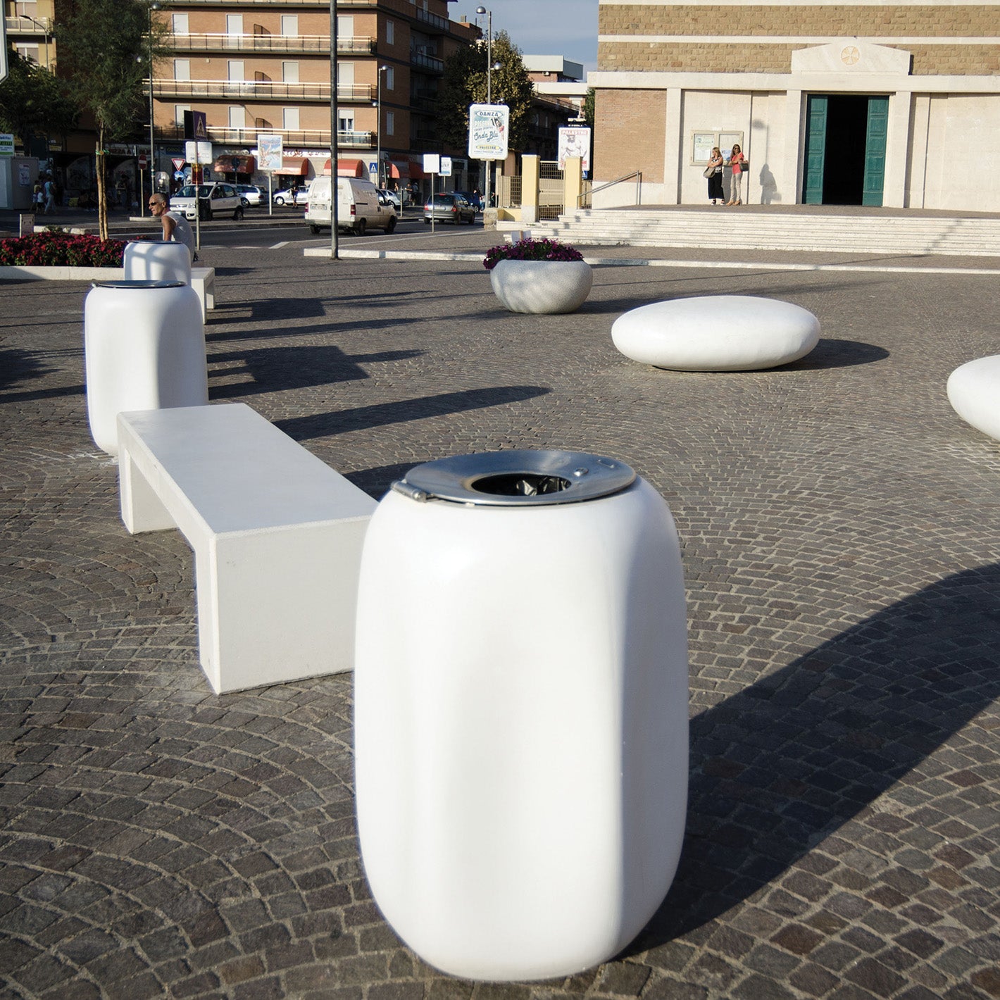 Abfalleimer aus HPC, High Performance Concrete ist Hochleistungsbeton für dünnwandige Bauteile mit feinen, matten Oberflächen, erhältlich in den Farben weiß, grau, dunkelgrau, grün und gelb.