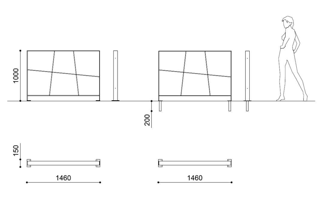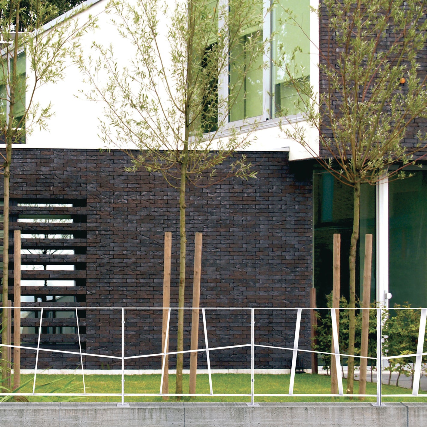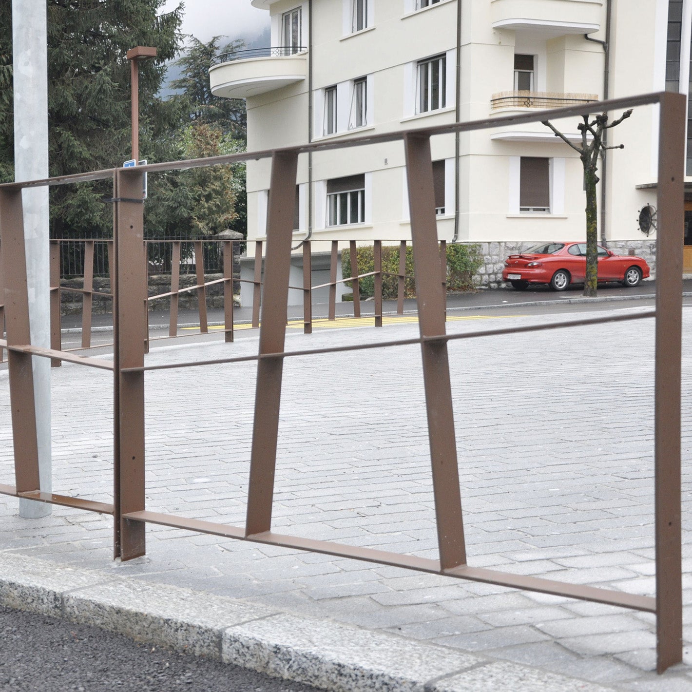 Route ist ein modulares Absperrelement, bestehend aus einem umlaufenden Profil aus Flachstahl und einer horizontalen Strebe sowie zwei schräg angeordneten, vertikalen Streben, die sich gegenseitig kreuzen und eine dynamische Struktur bilden.