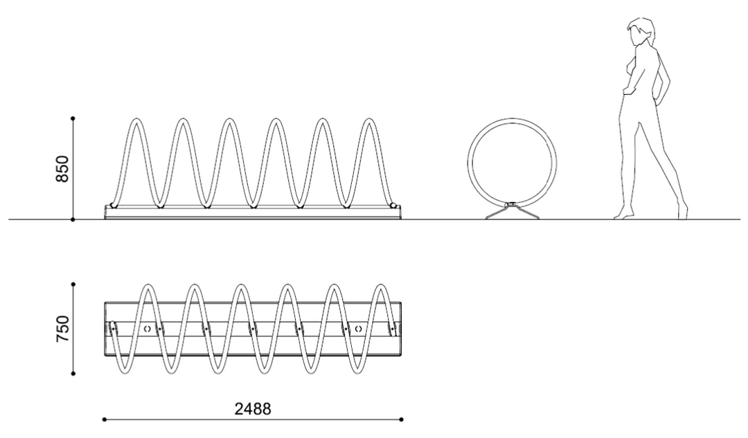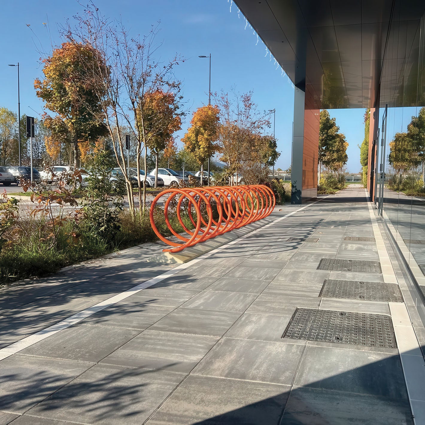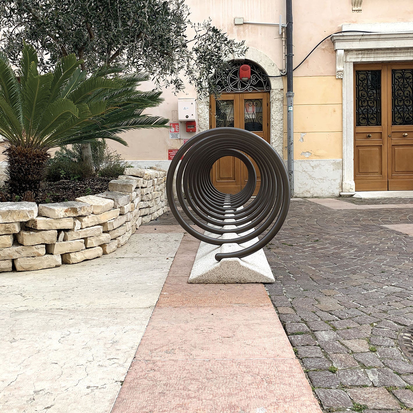 Spyra CL ist ein Fahrradständer aus spiralförmig gebogenem Stahlrohr, das wahlweise von einem Fuß aus PDM oder HPC getragen wird.